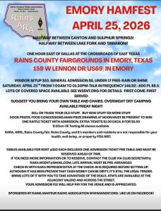 Emory Hamfest 7:00 am – 1:30 pmApril 25, 2026 Rains County Fairgrounds210 S Texas StEmory, Texas 75440View LocationMap Rains County Fairgrounds Posted by William Collier iCal Google View full calendar